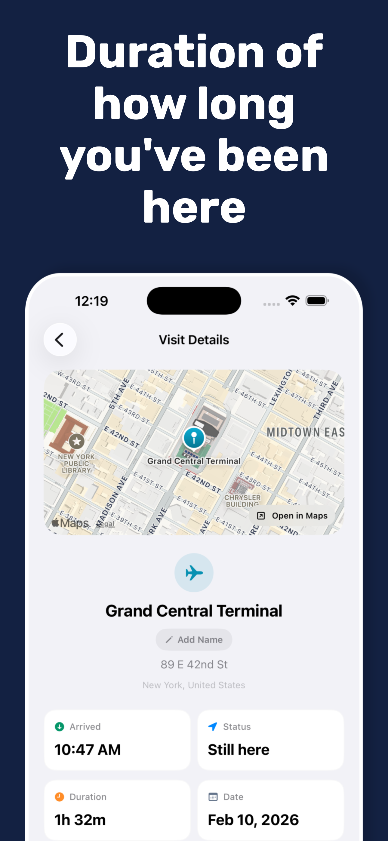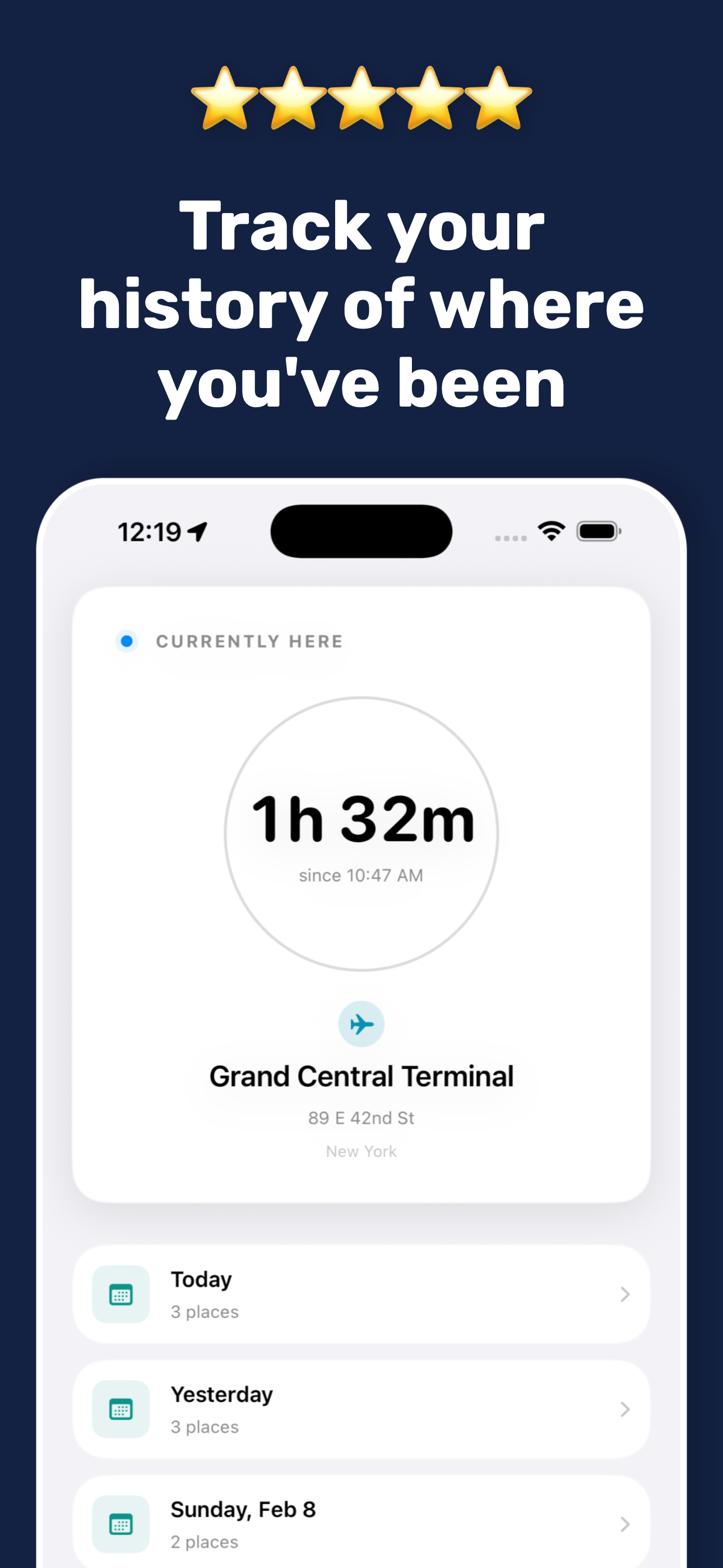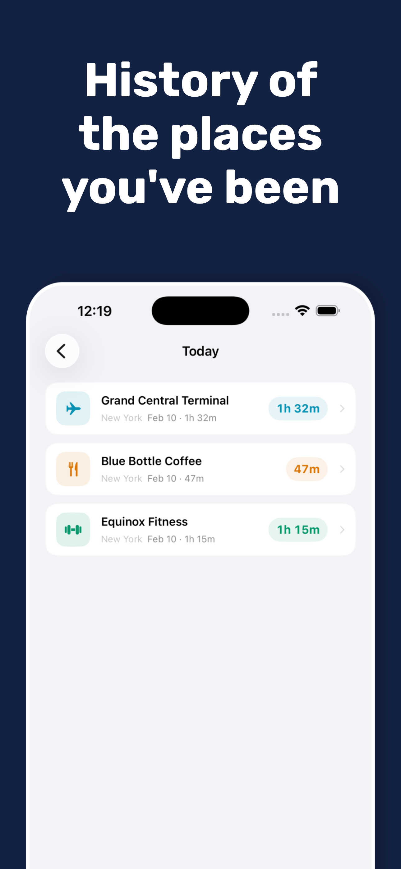 A live timer that starts automatically when you arrive. See your full history of every place you've visited, how long you stayed, and when.