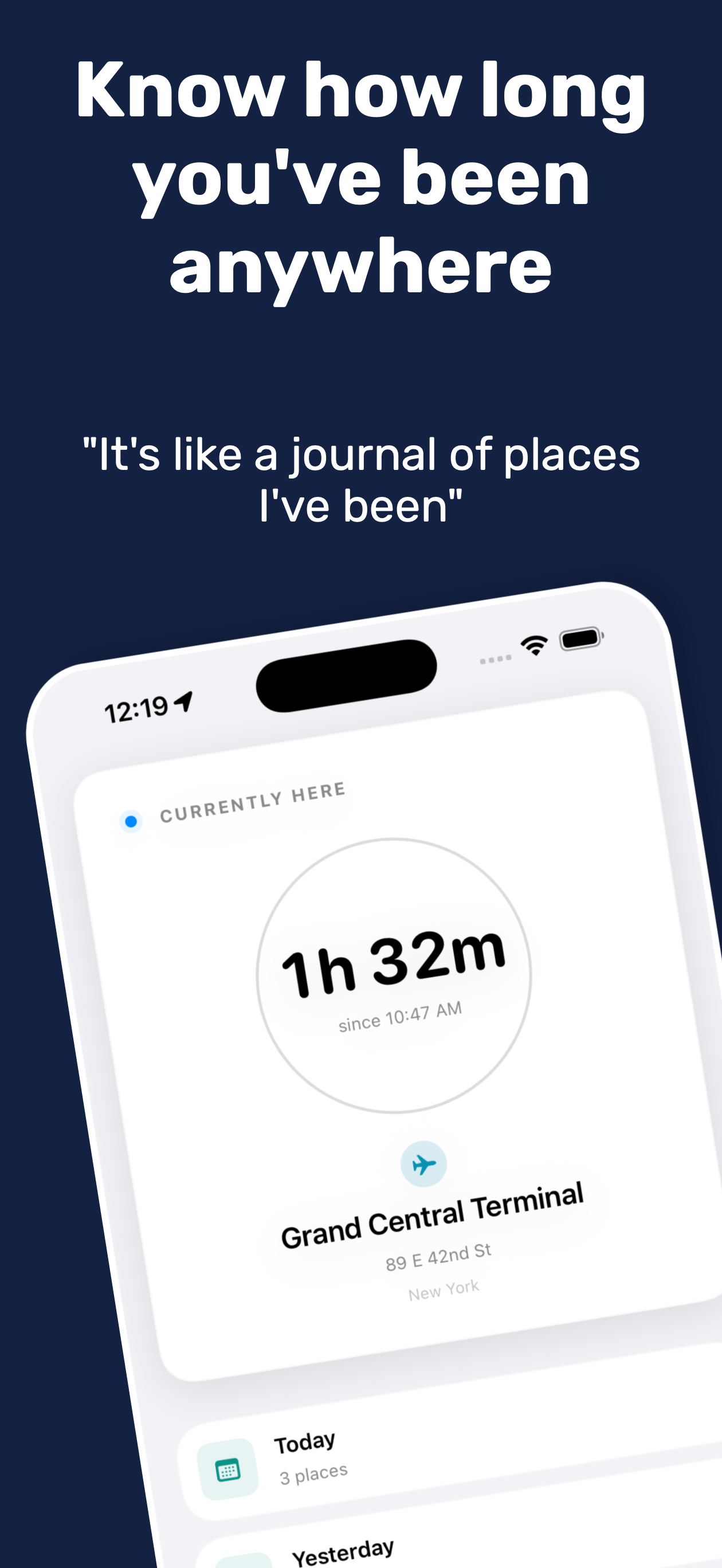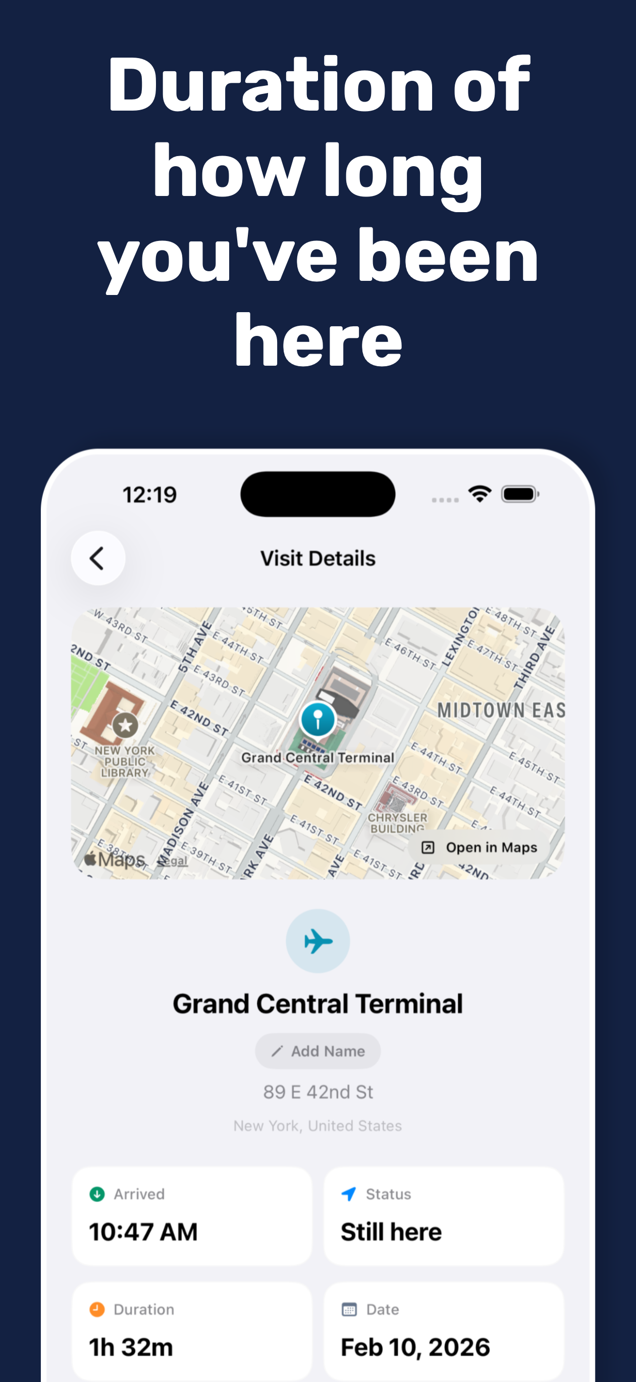 A real-time timer starts automatically when you arrive at any location. See exactly how long you've been there.