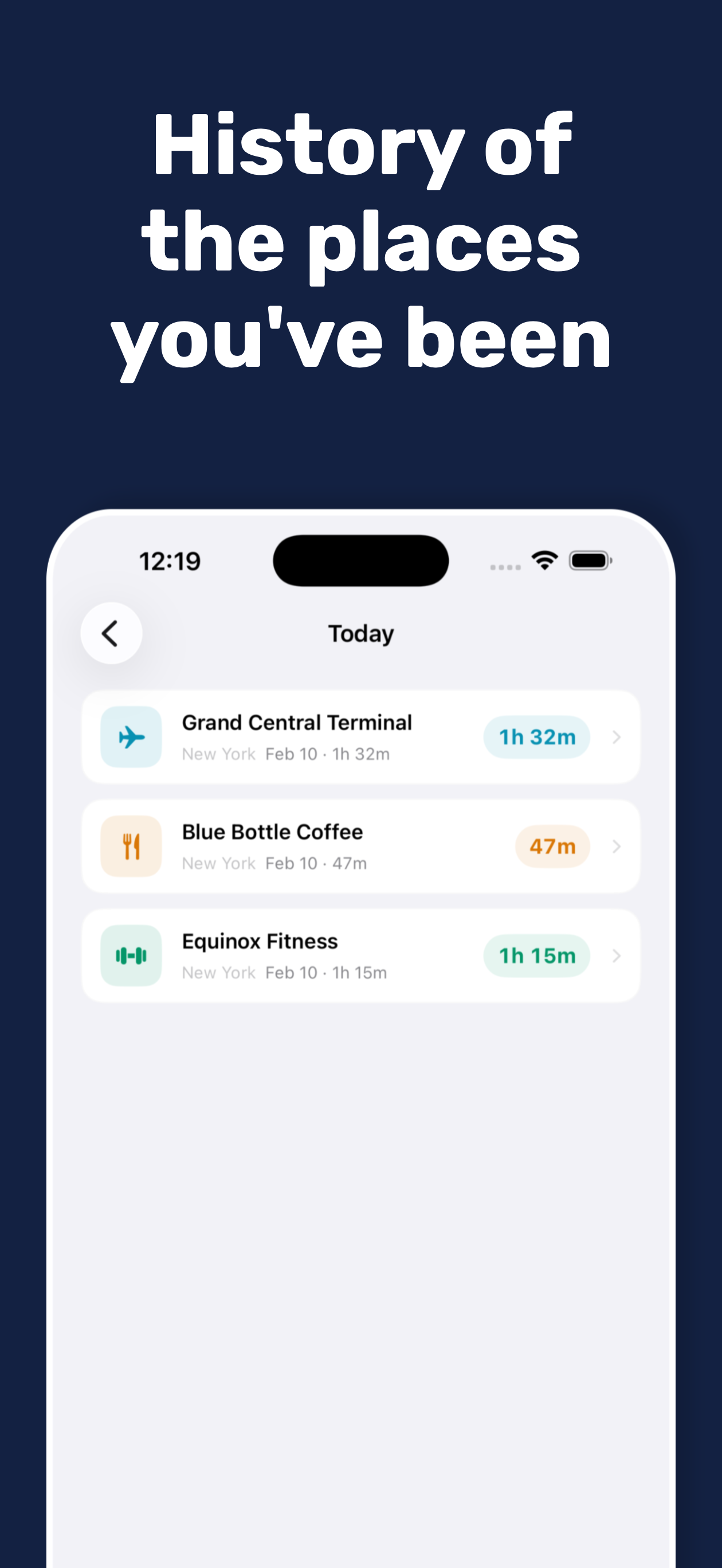 Browse your full history of visited places organized by day. See every arrival, departure, and how long you stayed.